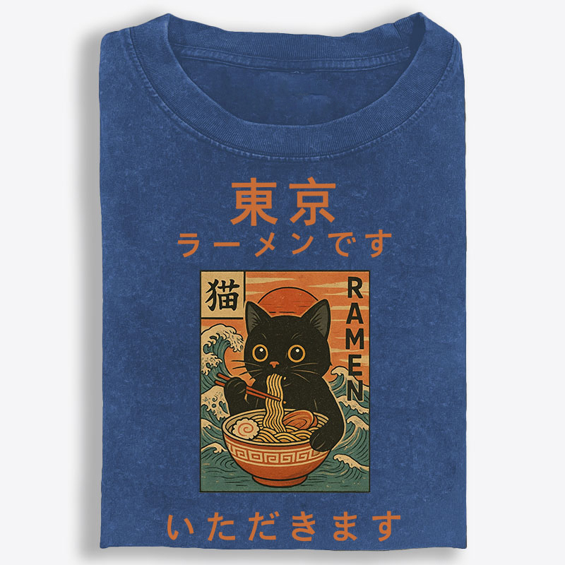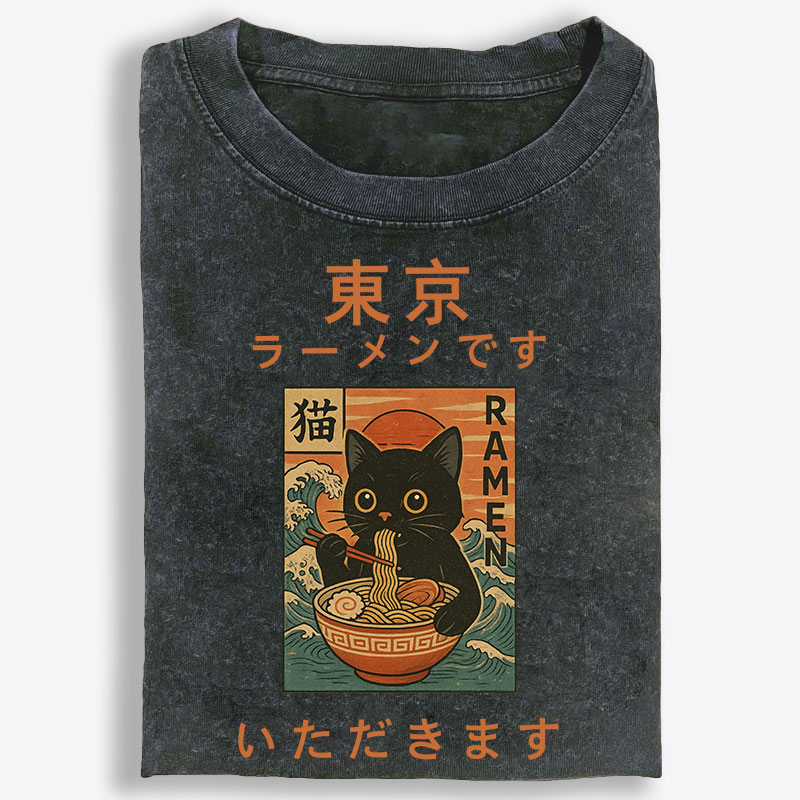 Tokyo Ramen Cat Retro Washed T-Shirt | 100% Cotton | Streetwear Essential