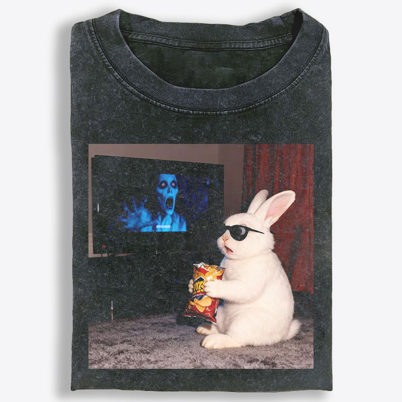 Horror Movie Watching Bunny Retro Washed T-Shirt | 100% Cotton | Streetwear Essential
