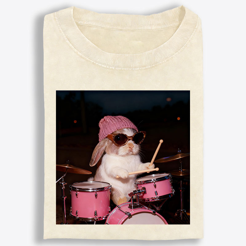 What makes this tee stand out is the graphic. Featuring a playful bunny behind a pink drum set, this design blends cute charm with cool performer energy in a way that feels instantly fun and memorable. Styled with a knit beanie and oversized sunglasses, the bunny gives off a confident, laid-back stage presence that adds attitude without trying too hard. The photo-style composition creates a trendy lifestyle feel, while the bright pink drums and relaxed expression make the artwork bold, eye-catching, and full of personality.