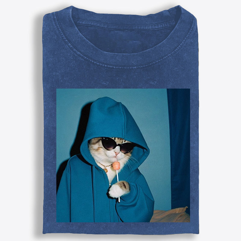 What makes this tee stand out is the graphic. Featuring a cool, low-key cat dressed in an oversized blue hoodie with dark sunglasses and a lollipop in paw, this design brings together clean streetwear attitude and playful meme-style charm. The monochrome blue tones create a sleek, modern visual that feels calm, confident, and instantly eye-catching without trying too hard. It is the kind of artwork that gives off laid-back energy with just enough edge—stylish, a little rebellious, and full of personality.