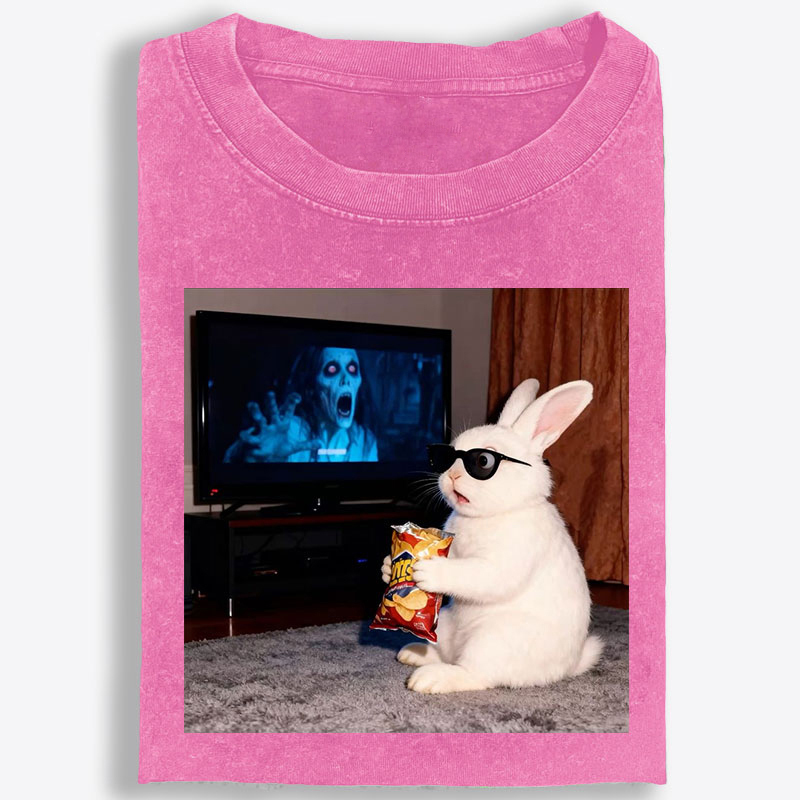 What makes this tee stand out is the graphic. Featuring a hilariously dramatic bunny sitting on the floor in dark sunglasses with a bag of chips in its paws while a horror movie plays in the background, this design perfectly captures the feeling of trying to stay cool during a scary movie. The contrast between the bunny’s cute appearance and the spooky movie-night setting makes the artwork instantly eye-catching, playful, and full of personality. It blends cozy-at-home vibes with meme-worthy humor in a way that feels funny, relatable, and impossible to ignore.
