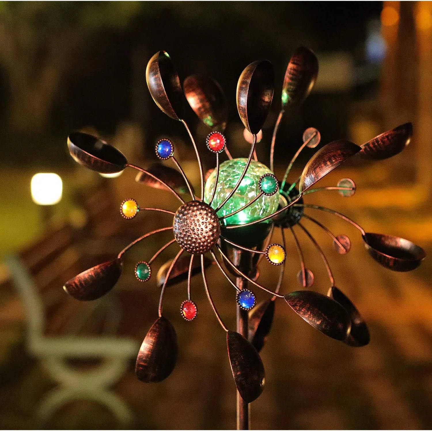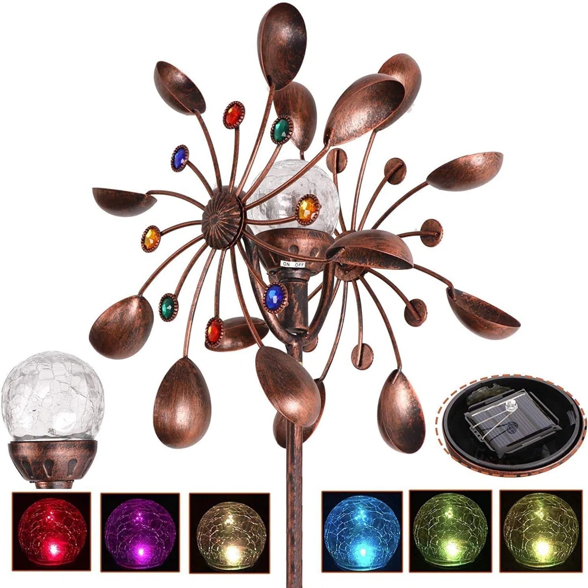 【KINETIC DESIGN】:The crackle glass ball sits between two tiers of gracefully spinning wind blades, offering a stunning display of jewel tone colors for up to 8 hours.During the day, enjoy the kinetic movement of the wind spinner while the solar panel converts sunlight to electricity. At night, the spinner?s LED light provides an ambient color changing light display.