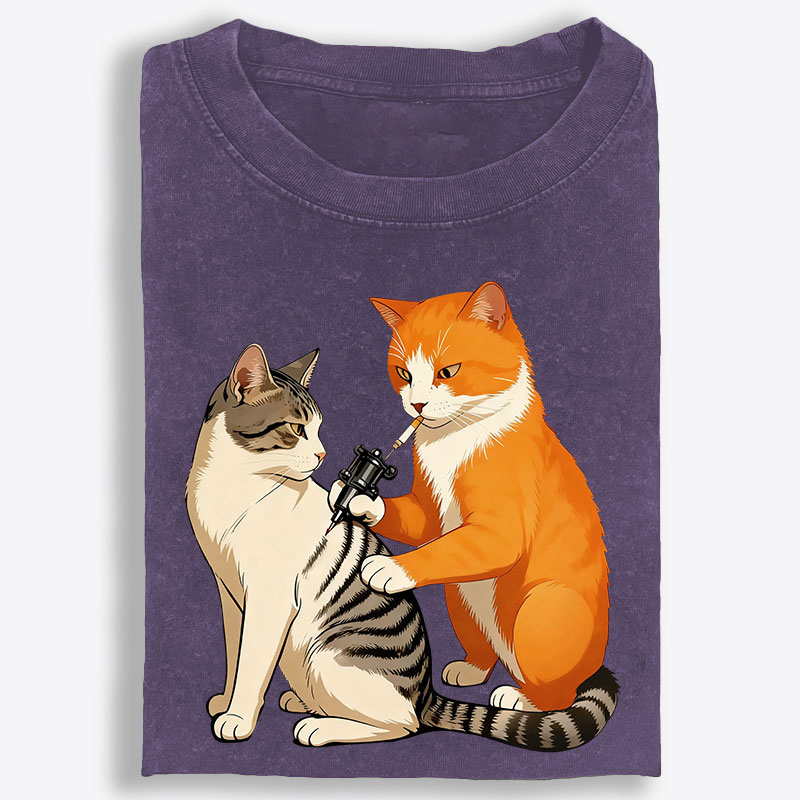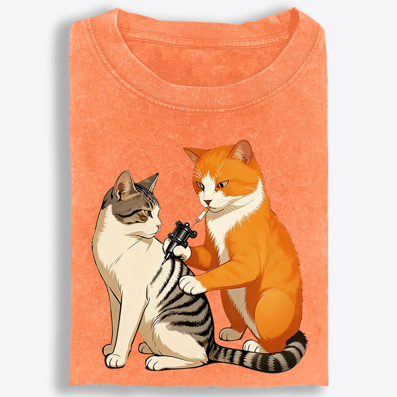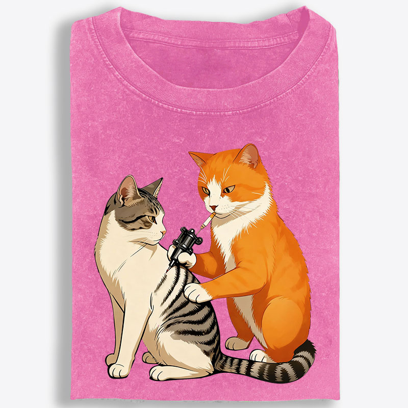 What makes this tee stand out is the graphic. Featuring a bold orange cat confidently holding a tattoo machine while working on another cat, this design turns a playful animal illustration into a funny, unexpected statement piece. The scene feels mischievous, creative, and full of attitude, making it the kind of artwork that instantly grabs attention and sparks conversation. The clean illustrated style keeps the design sharp and eye-catching, while the mix of humor, rebellious energy, and quirky storytelling gives it a strong personality that stands out from ordinary graphic tees.