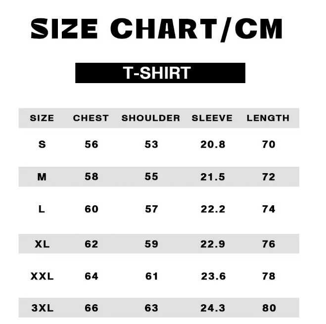 • Size range: S – 3XL(Measurements in cm: chest width / shirt length / sleeve length)